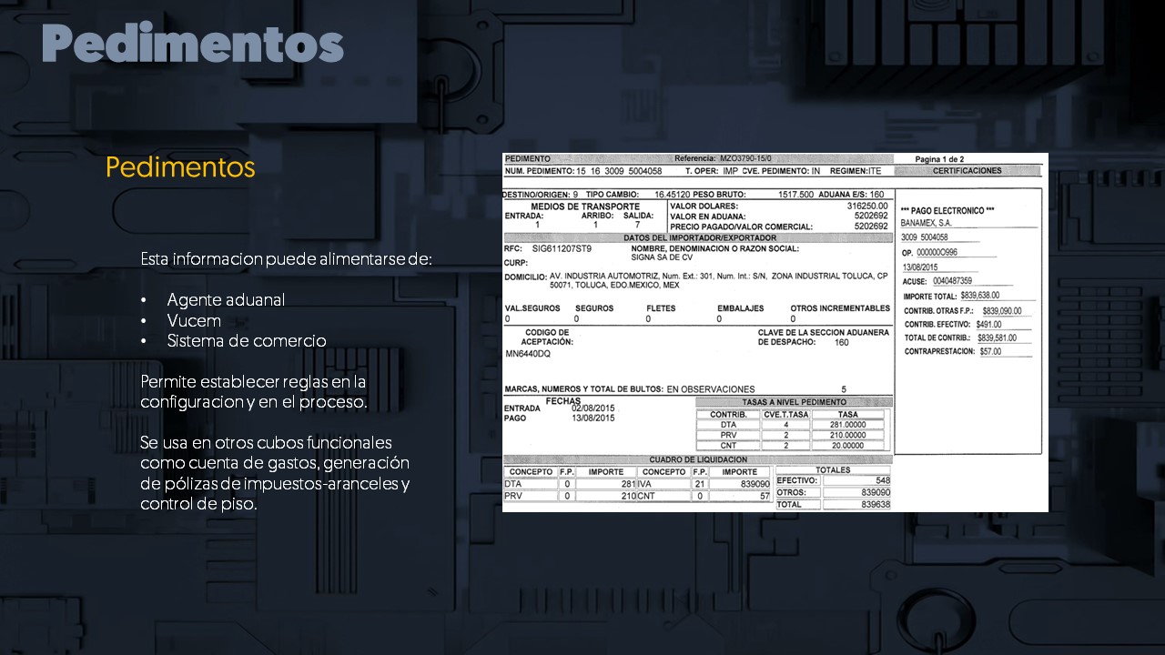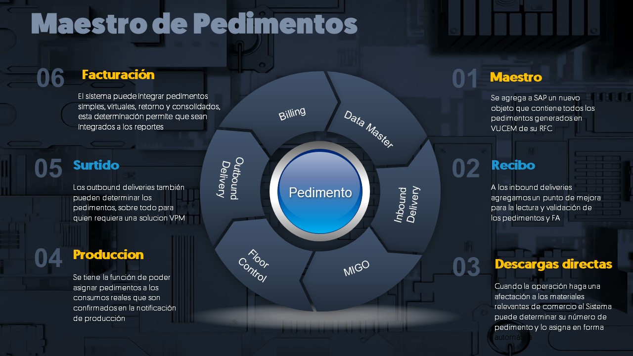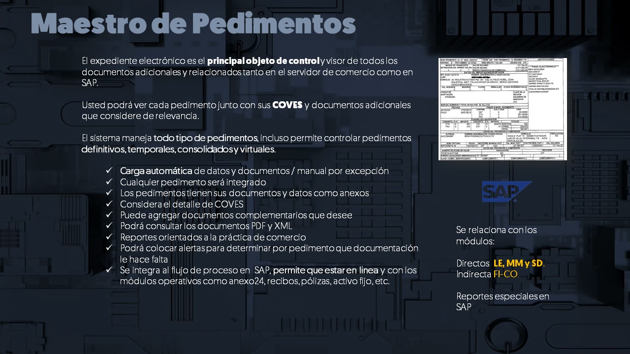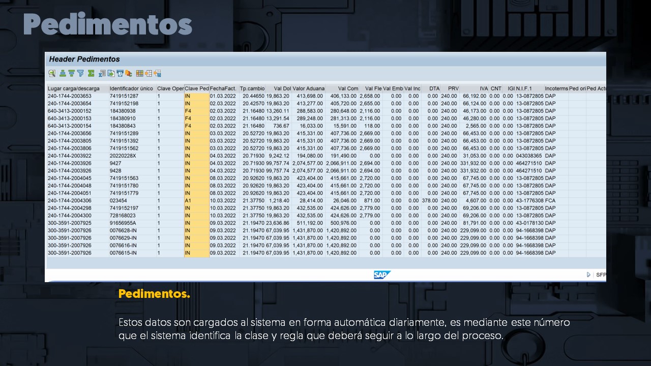 Al integrar en SAP el número del pedimento da la posibilidad de saber que tipo de operación realizará, es decir los cubos funcionales reaccionarán a diferentes escenarios de proceso.